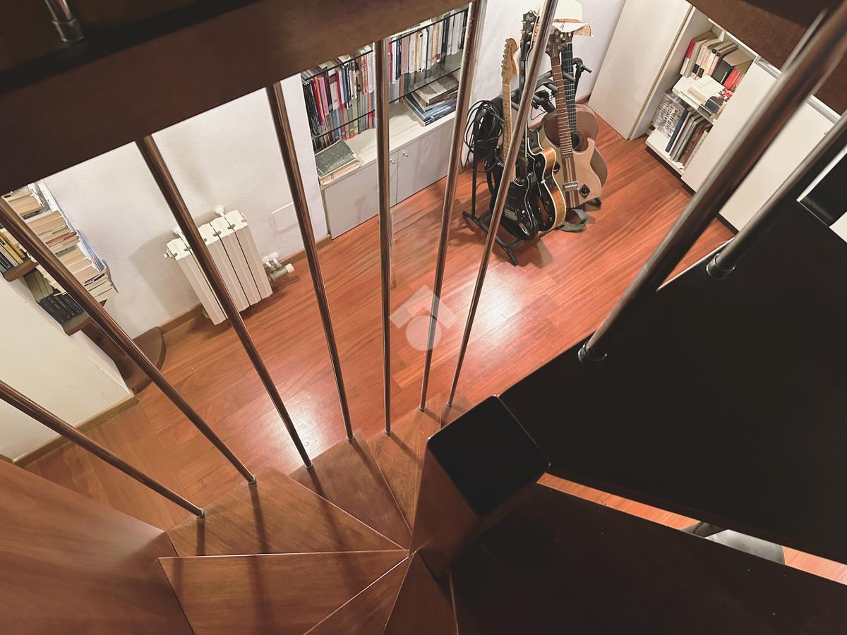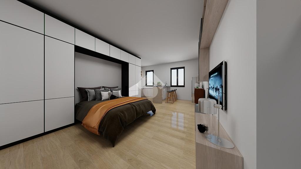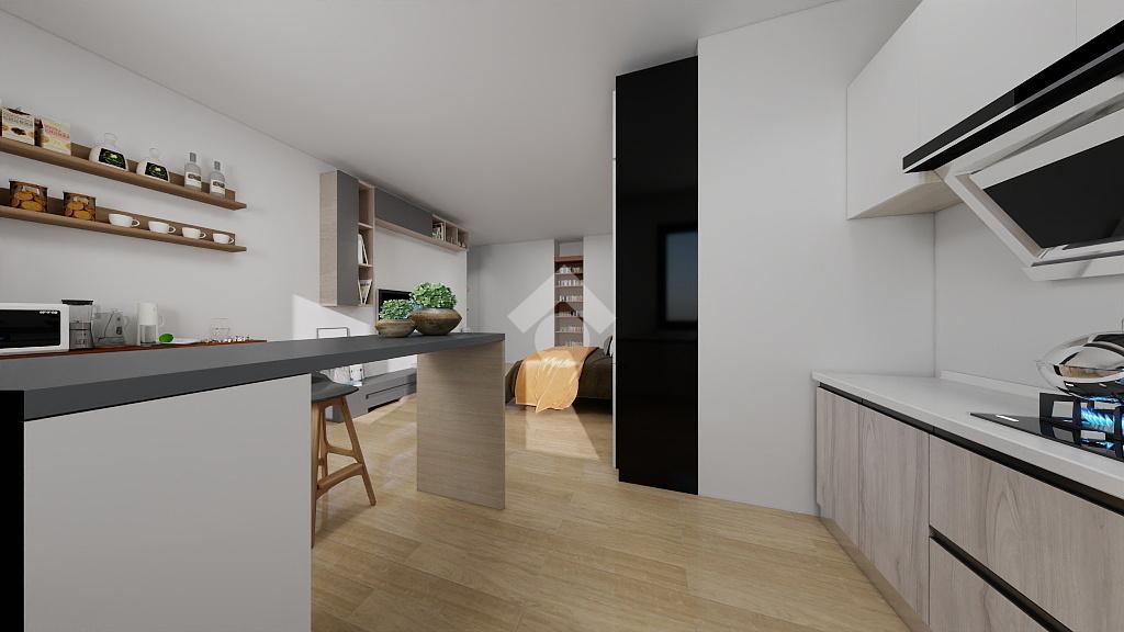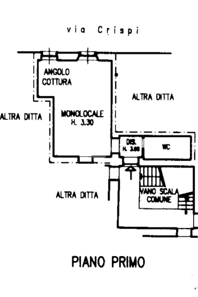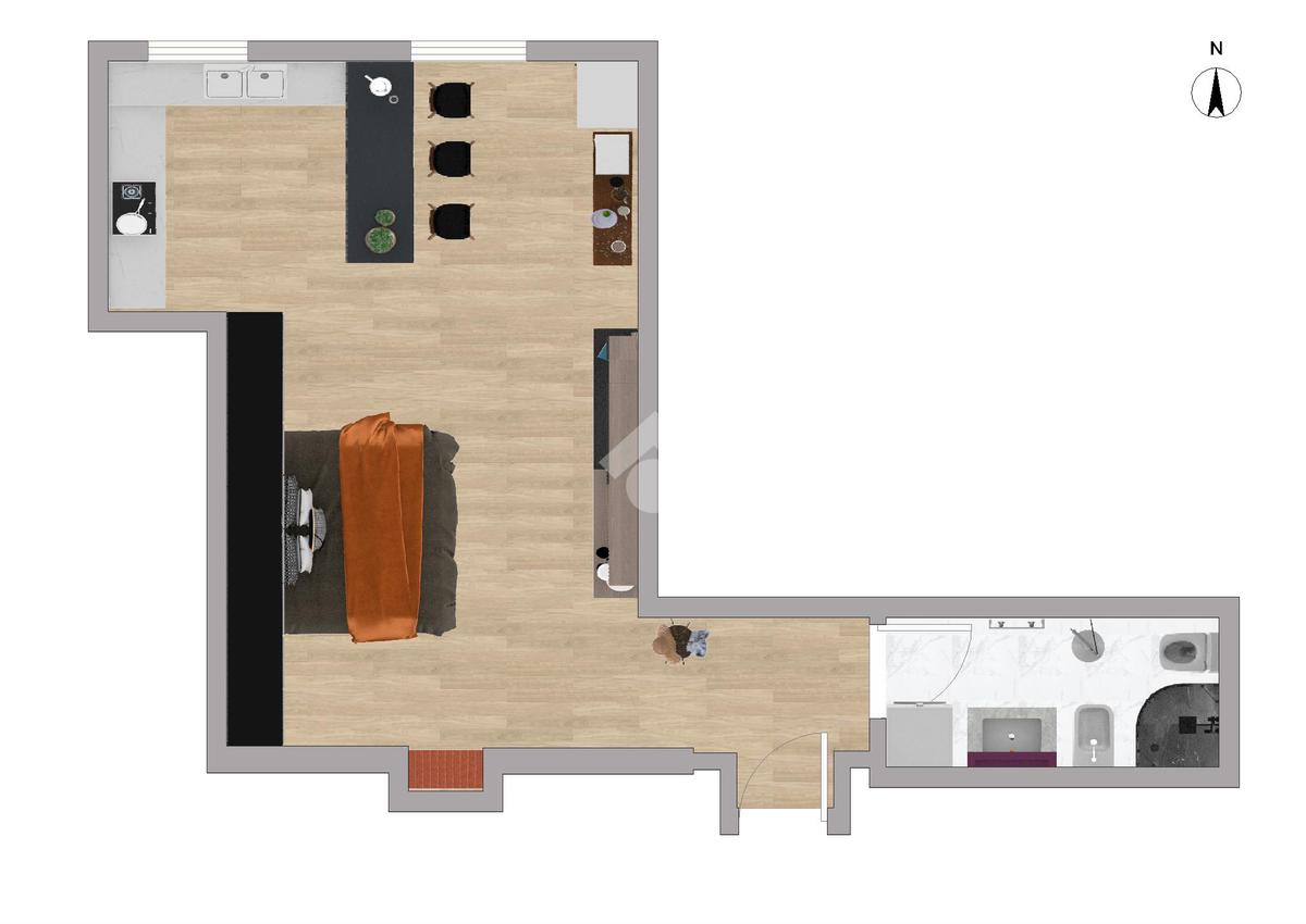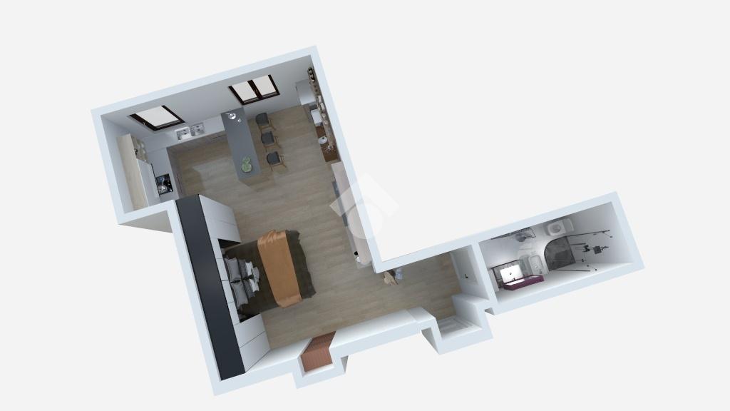 L’appartamento è composto da ingresso su un ampio locale open-space con angolo cottura, oltre scala a chiocciola che porta ad un piccolo soppalco (NON abitabile). La disposizione permette di ben organizzare lo spazio giorno/notte ed il disimpegno conduce ad un Bagno completo, con doccia (senza finestra).