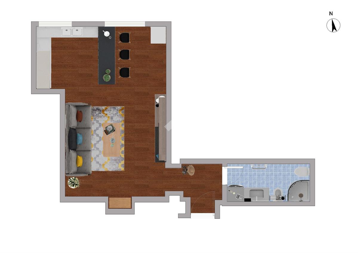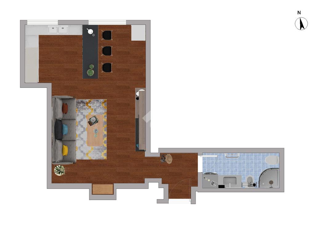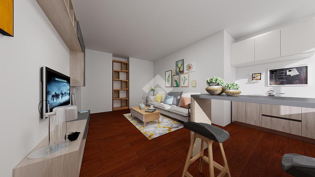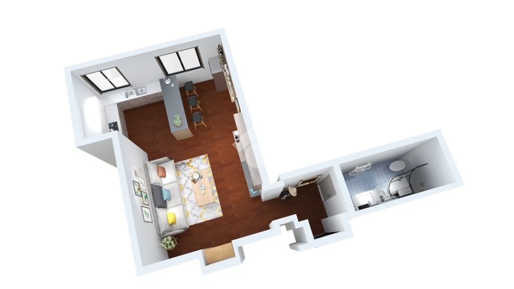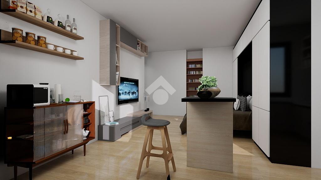 L’appartamento è composto da ingresso su un ampio locale open-space con angolo cottura, oltre scala a chiocciola che porta ad un piccolo soppalco (NON abitabile). La disposizione permette di ben organizzare lo spazio giorno/notte ed il disimpegno conduce ad un Bagno completo, con doccia (senza finestra).